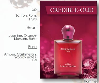 Credible Oud is a luxurious, intense fragrance built around the warmth of oud. Its deep woody notes and smooth oriental character create a scent that feels bold, elegant, and long-lasting. Perfect for evening wear, it adds a refined touch of confidence and sophistication.