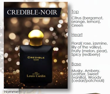 Credible Noir is a rich, sophisticated fragrance with a deep masculine character. It combines smooth, dark notes with a refined finish, creating a scent that feels elegant, confident, and memorable. Ideal for evening wear or formal occasions, it leaves a strong impression without overpowering.