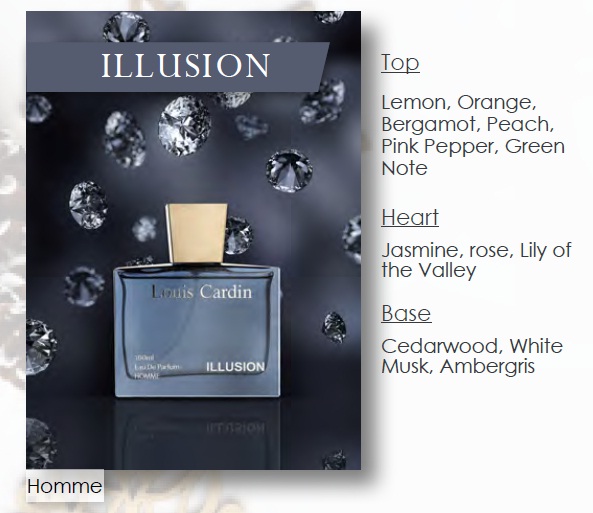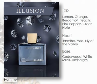 Illusion is a captivating fragrance with a soft yet striking character. It blends fresh, elegant notes with a smooth warm finish, creating a scent that feels mysterious, refined, and memorable. Perfect for everyday wear or evenings out, it leaves a subtle but lasting impression.