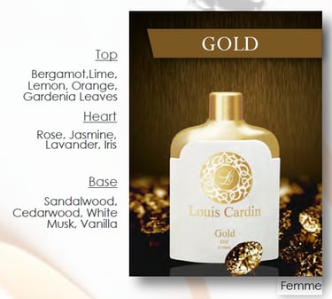 Louis Cardin Gold is a refined fragrance with a luxurious and confident character. It blends smooth, warm notes with an elegant finish, creating a scent that feels rich, stylish, and long-lasting. Perfect for special occasions or everyday sophistication.