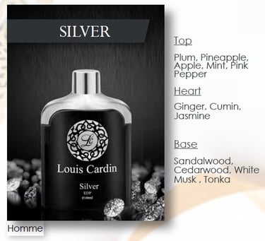 Louis Cardin Silver is a sleek, modern fragrance with a fresh and polished character. It offers a clean blend of refined notes with a smooth, long-lasting finish, making it versatile for daily wear. A confident choice with a crisp, sophisticated feel.