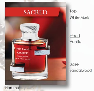Louis Cardin Sacred is a deep, elegant fragrance with a rich and refined presence. It balances warm, sophisticated notes with a smooth finish, creating a scent that feels timeless, luxurious, and memorable. Ideal for evening wear or special moments.